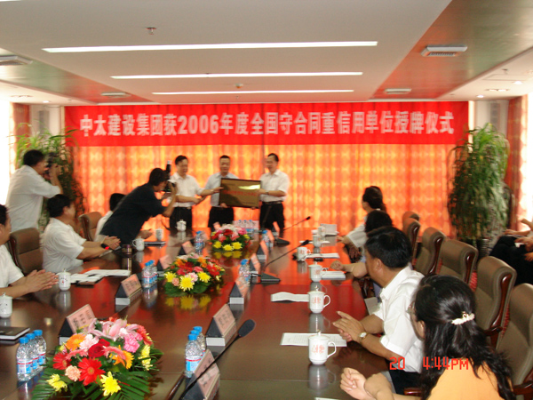 中太建設(shè)集團獲2006年度全國守合同重信用單位授牌儀式于2007年8月20日在中太大廈十六樓會議室舉行。河北省工商行政管理局受國家工商行政管理總局的委托,向中太建設(shè)集團授予獎牌。