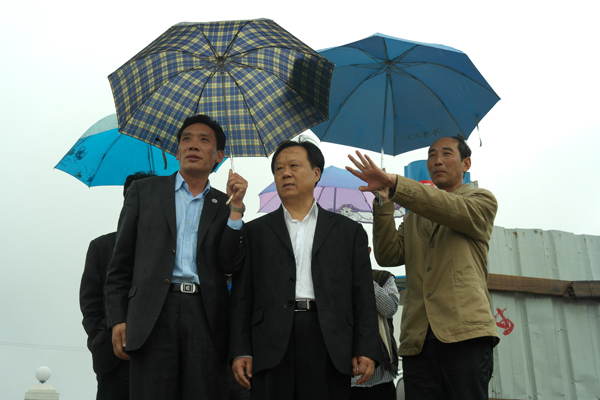 董事局主席李文。ㄖ校┰诎不辗止究偨(jīng)理陳德剛(左)的陪同下,冒雨視察項(xiàng)目工地