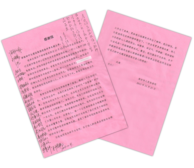 集團(tuán)公司董事局主席、黨委書記李文健,黨委副書記鐘崇鶴分別在感謝信上做出批示,要求中太建設(shè)集團(tuán)全體員工向?qū)O彥池同志學(xué)習(xí),弘揚(yáng)救死扶傷的人道主義精神。